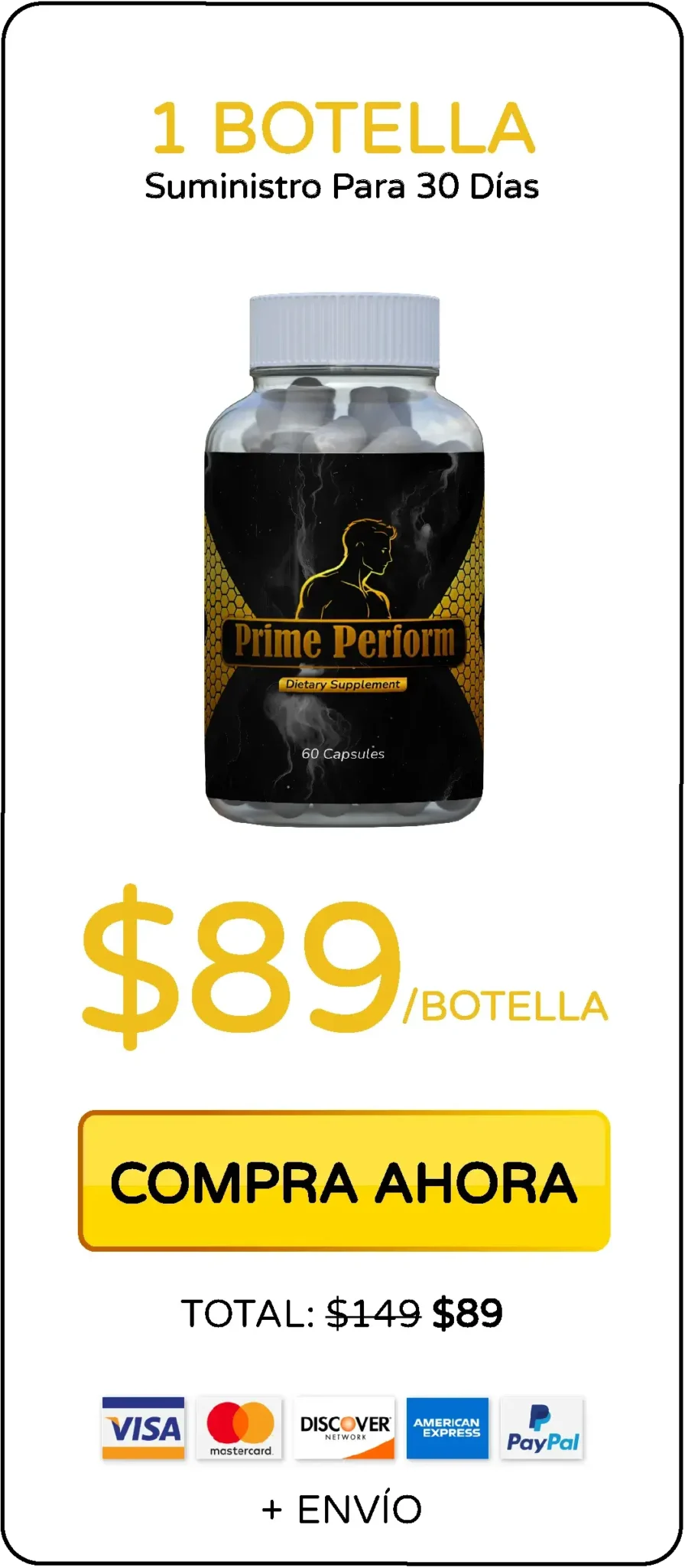 What if it doesn't work? Calm down. You have 60 full days to try Prime Perform and notice the difference in your energy and performance. If you are not satisfied, just write to us and we will refund you. every penny, without questions or complications. That's how confident we are that you're going to love it what Prime Perform will do for you. You have nothing to lose, only everything to gain.